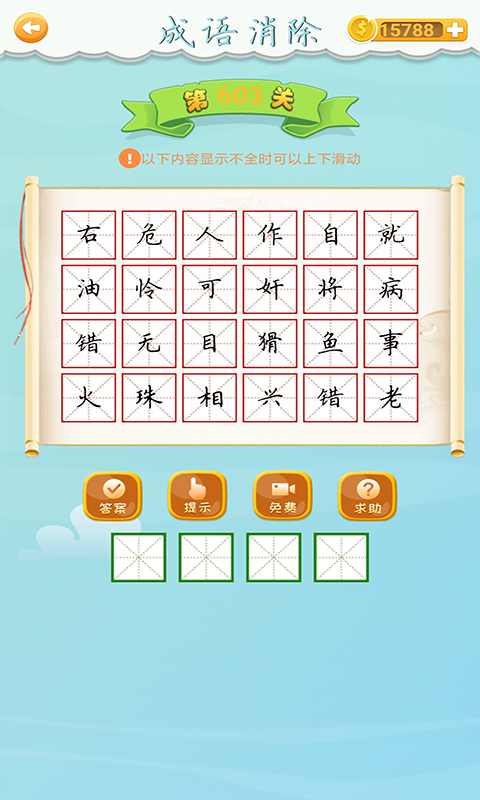 【成语故事】提供一段成语相关的故事,你可以选择听或者看两种方式阅读,阅读完成之后需要猜出故事所讲的成语; 【成语消除】把多条成语中的文字顺序打乱,你需要重新按照正确的顺序排列出来; 【成语释义】提供一条成语的释义,你需要根据这条释义猜出正确的成语; 【成语排错】在提供的四条成语中找出每条成语的错别字; 【成语图片】通过一张图片来猜测相关的成语。巧妙的图与字的结合,让你苦思冥想后恍然大悟,开怀一笑; 【成语字典】通过输入关键字来搜索成语,结果也会对关键字进行加重显示,点击成语会展示拼音、近义词、反义词、典故等多个成语详情,让你不知不觉间就拓展了自己的成语储备量; 【我的收藏】展示游戏过程中你所收藏的成语; 【我的战绩】展示游戏当中你所答对的成语; 游戏过程中通过金币来激励你学习的动力,并且,还可以通过你手机中安装的社交软件进行分享、求助你的朋友们! 如果你想测试一下自己、想挑战一下自己、想提高自己的成语储量,不妨将它安装在你的手机上。还犹豫什么、赶紧动手吧。